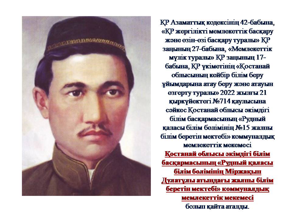 "Рудный қаласы білім бөлімінің Міржақып Дулатұлы атындағы жалпы білім беретін мектебі"КММ .