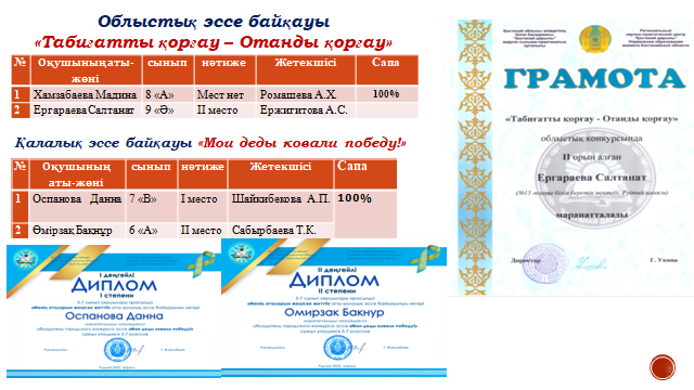 1-2 сыныптар арасында «Күзгі бояулар» атты көркем сөз байқауының қалалық кезеңі өтті. Байқауға 1-2 сынып оқушылары қатысты. Нәтижесінде 1″А»сынып оқушысы Абдибаева Нурсила 3 орын, жетекшісі: Салтенова Н.С, 2″В»сынып оқушысы Өтеміс Бақдаулет 1 орын, жетекшісі: Шомаева О.Б. Оқушыларымыз бен жетекшілерін жеңістерімен құттықтаймыз!!!