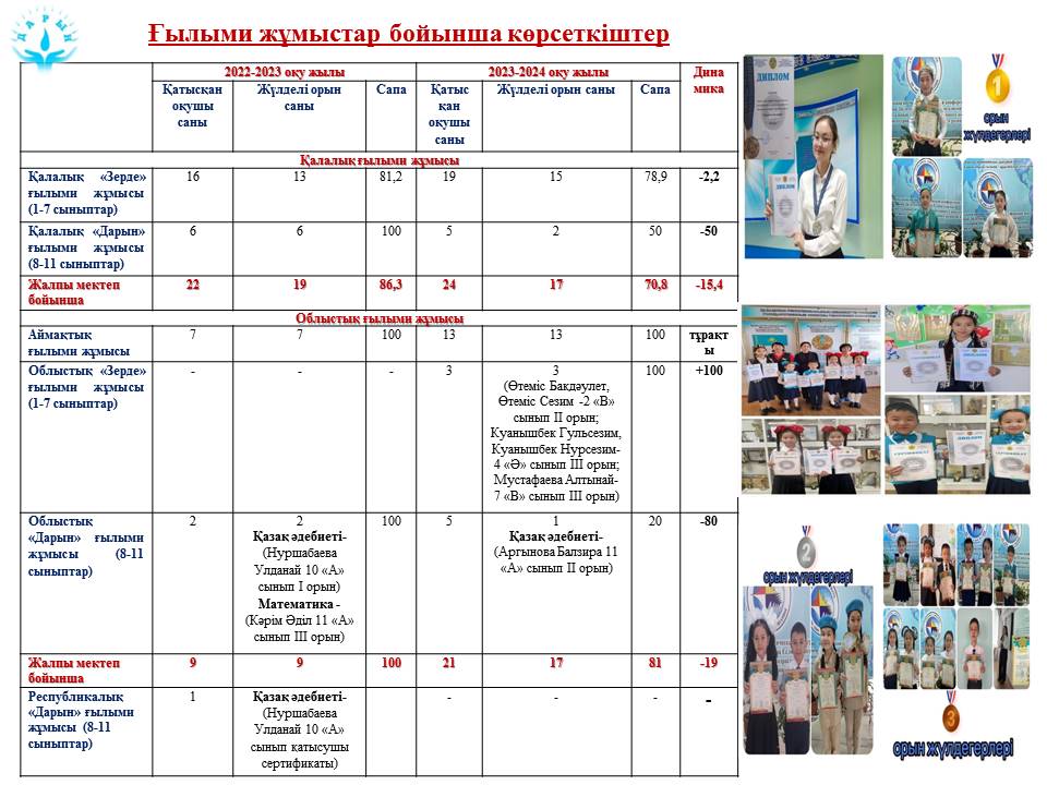 | 3 | 1. 8-11 сынып аралығындағы “Дарын” ғылыми жобалар байқауына оқушылардың қатысуын қадағалау, даярлау. 2. Мектепішілік пәндер апталығына ат салысу. | Ержигитова А.С. Исмакова С.Б. Бейсенгалиева Ж.Г. Омиржанова С.Е. Кенбаева Ж.С. Жоба жетекшілері | Қараша-сәуір | Сұраныс |