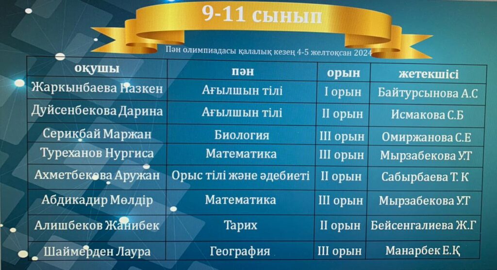 | 8 | Түрлі деңгейдегі (қалалық, облыстық, республикалық, халықаралық) қашықтық олимпиадаларға, зияткерлік байқауларға оқушыларды қатыстыру (КИО, Бульдог, Дарабоз) | Ержигитова А.С. Пән мұғалімдері | Қараша 2-4 апта аралығы Жыл бойы | бұйрық, сұраныс, есеп, байқау материалдары |