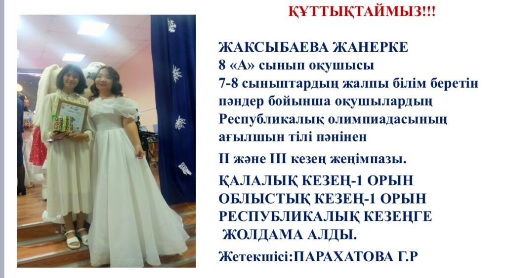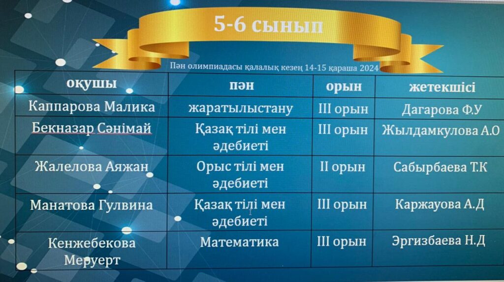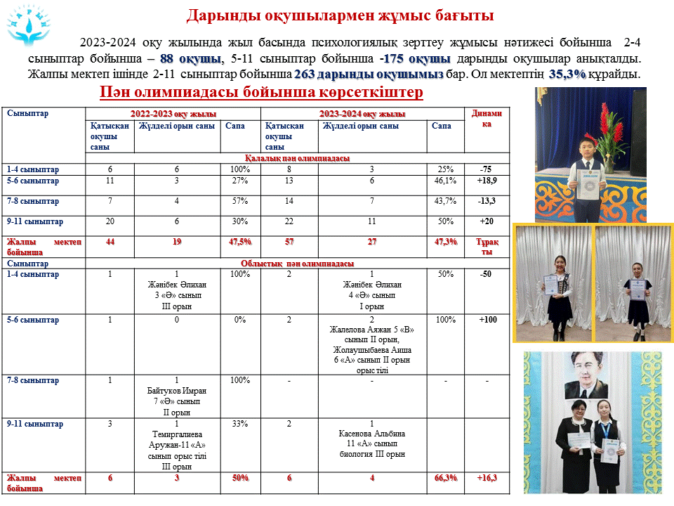 Жалпы 5-11 сыныптар аралығында Республикалық пән олимпиадасының II-ші қалалық кезеңіне 64 оқушы қатысып,20 оқушы жүлделі орынға ие болды. Сапа 31%