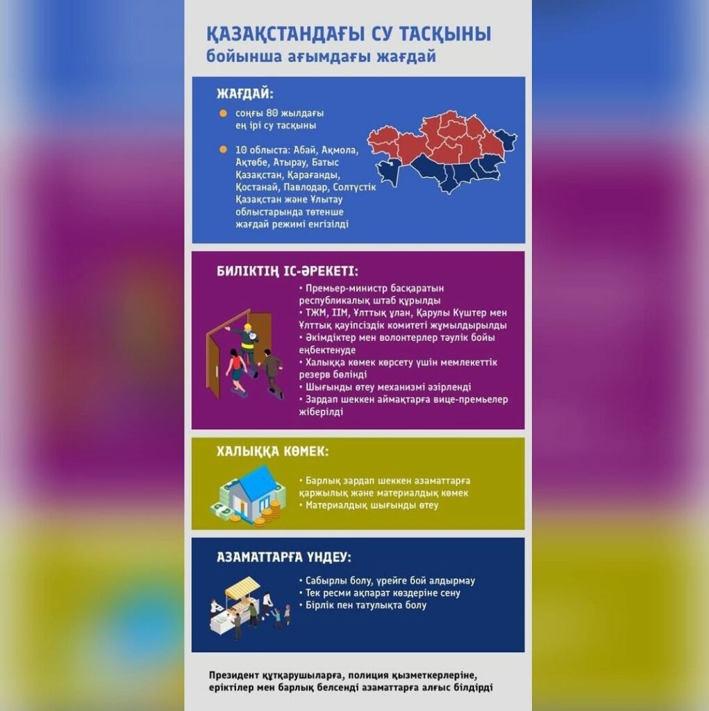 Су тасқынына байланысты еліміздің он аймағында төтенше жағдай жарияланды, яғни Абай, Ақмола, Ақтөбе, Атырау, Батыс Қазақстан, Қарағанды, Қостанай, Павлодар, Солтүстік Қазақстан және Ұлытау облыстарында.