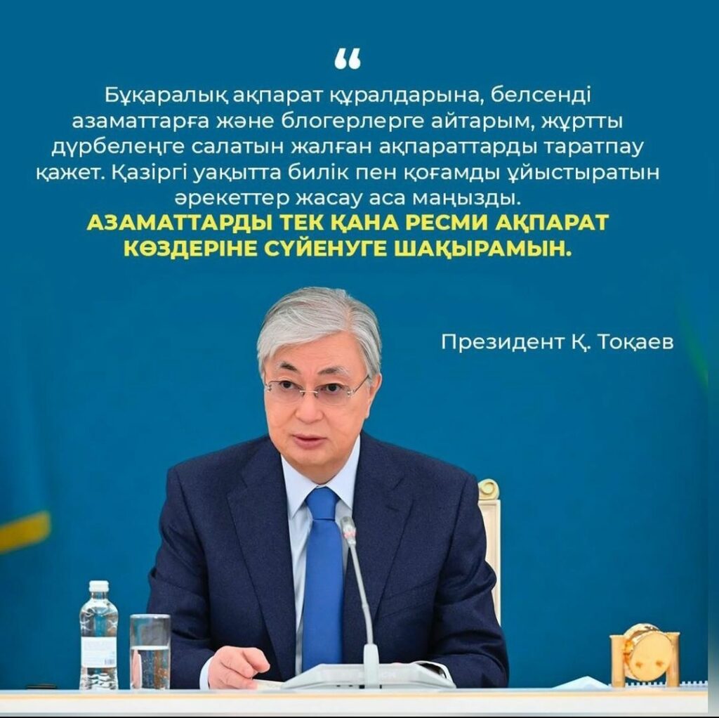 Бұқаралық ақпарат құралдарына, белсенді азаматтарға және блогерлерге айтарым, жұртты дүрбелеңге салатын жалған ақпараттарды таратпау қажет. Қазіргі уақытта билік пен қоғамды ұйыстыратын әрекеттер жасау аса маңызды. Азаматтарды тек қана ресми ақпарат көздеріне сүйенуге шақырамын.