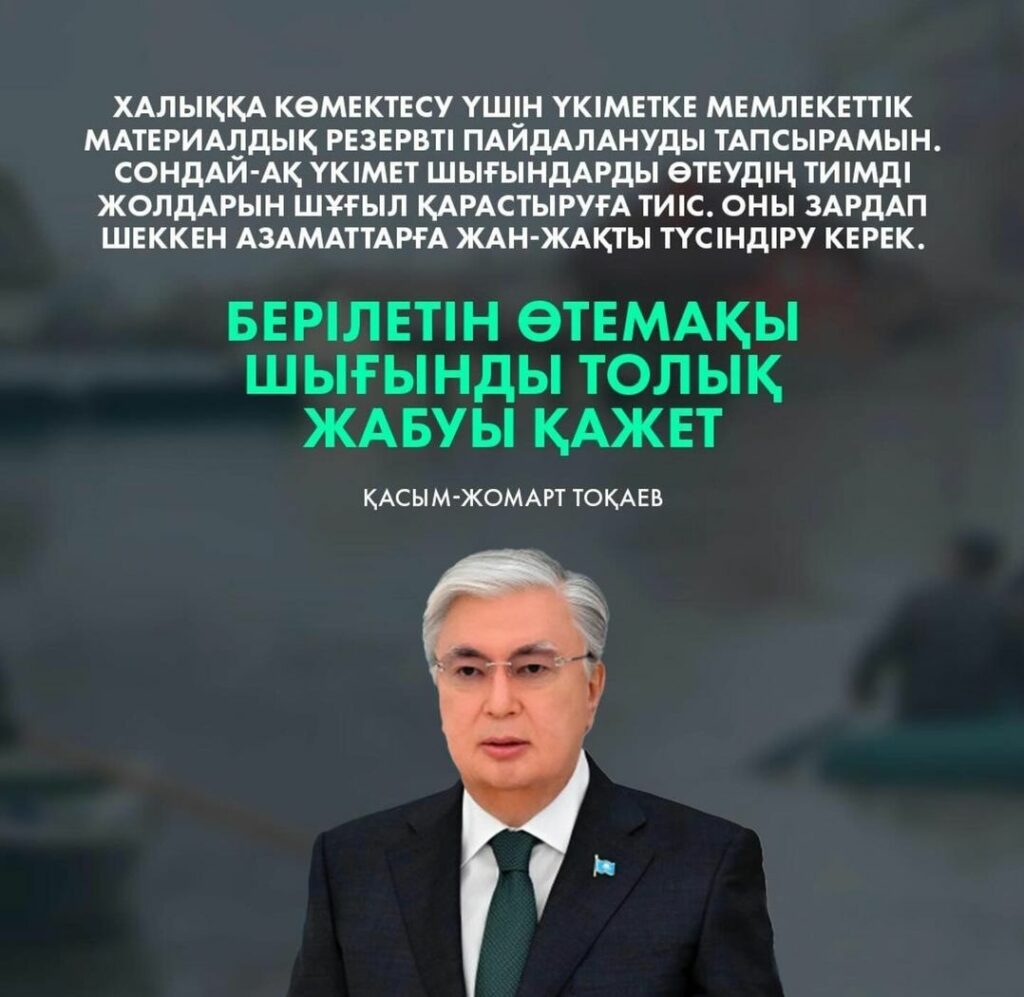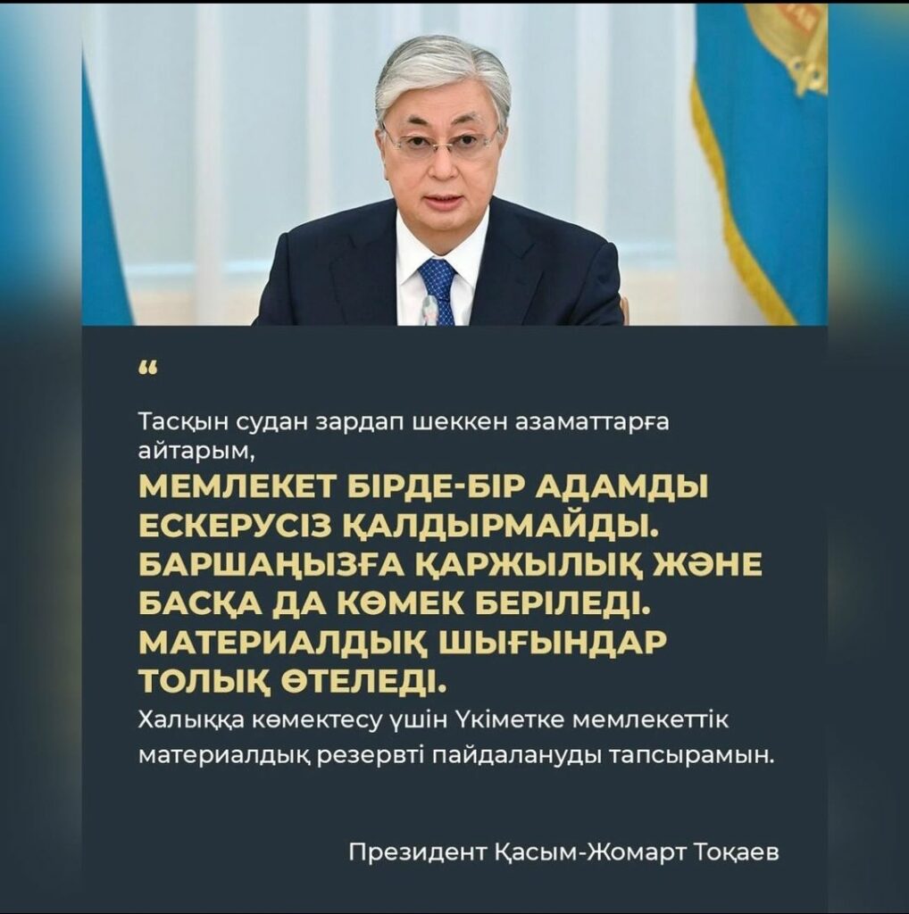 Құтқарушыларға, тәртіп сақшыларына, волонтерлерге және апатпен күресуге атсалысып жатқан барша жұртқа алғысымды айтамын. Осындай қиын-қыстау кезде бір жағадан бас, бір жеңнен қол шығару айрықша маңызды. Бір ел, бір халық болып жұмылып, бұл апатты еңсереміз. Бұл біздің қолымыздан келеді.